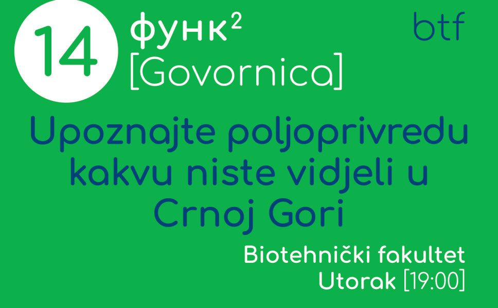 U okviru Festivala umjetnosti, nauke i kulture – FUNK 2025, Biotehnički fakultet Univerziteta Crne Gore organizuje FUNK interaktivnu govornicu „Upoznajte poljoprivredu kakvu niste vidjeli u Crnoj Gori“, 14. oktobra u 19.00 časova,...