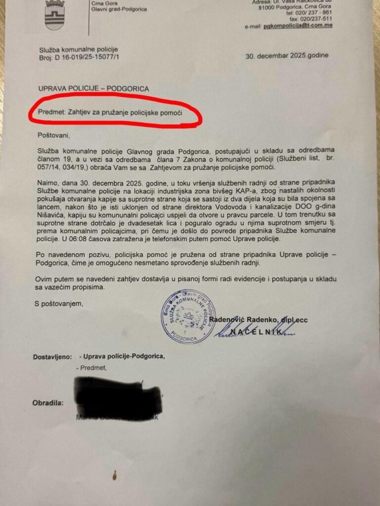 Podsjećamo da je tom prilikom Komunalna policija Glavnog grada, putem Dežurne službe Odjeljenja bezbjednosti Podgorica, obavijestila Upravu policije da je službenik Komunalne policije Glavnog grada, prilikom preduzimanja službenih mjera i radnji povrijeđen, te zatražila asistenciju Uprave policije u cilju daljeg zakonitog sprovođenja aktivnosti. Navedeni zahtjev je dostavljen i u pisanoj formi Odjeljenju bezbjednosti Podgorica, od strane načelnika Službe komunalne policije, koji dostavaljamo u prilogu.